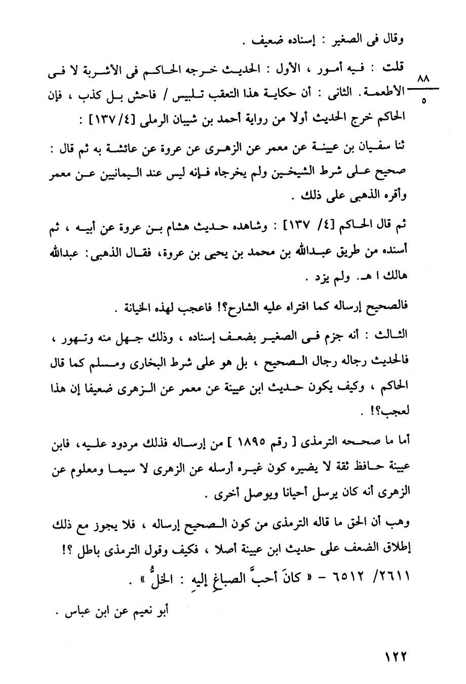 الثالث: أنه جزم في الصغير بضعف إسناده، وذلك جهل منه وتهور، فالحديث رجاله رجال الصحيح، بل هو على شرط البخارى ومسلم كما قال الحاكم، وكيف يكون حديث ابن عيينة عن معمر عن الزهرى ضعيفا إن هذا لعجب؟!.