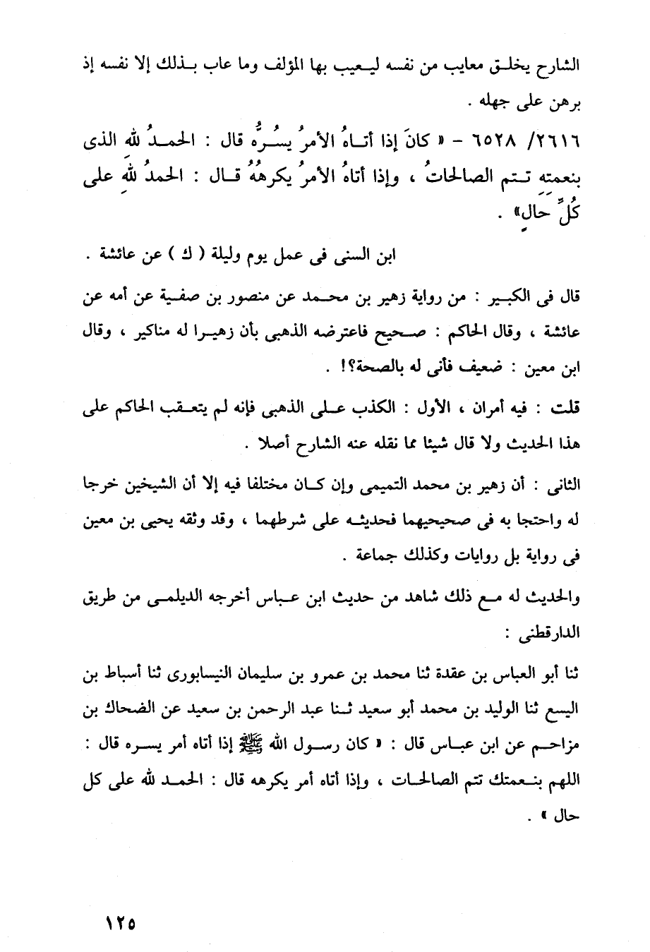 ثنا أبو العباس بن عقدة ثنا محمد بن عمرو بن سليمان النيسابورى ثنا أسباط بن اليسع ثنا الوليد بن محمد أبو سعيد ثنا عبد الرحمن بن سعيد عن الضحاك بن مزاحم عن ابن عباس قال: "كان رسول اللَّه -صلى اللَّه عليه وسلم- إذا أتاه أمر يسره قال: اللهم بنعمتك تتم الصالحات، وإذا أتاه أمر يكرهه قال: الحمد للَّه على كل حال".