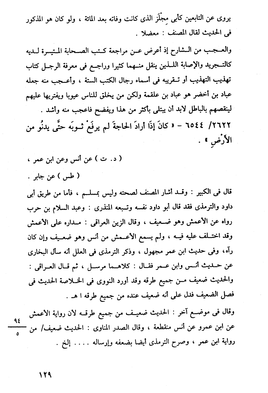 وقال في موضع آخر: الحديث ضعيف من جميع طرقه لأن رواية الأعمش عن ابن عمرو عن أنس منقطعة، وقال الصدر المناوى: الحديث ضعيف من رواية ابن عمر، وصرح الترمذى أيضًا بضعفه وإرساله. . . إلخ.