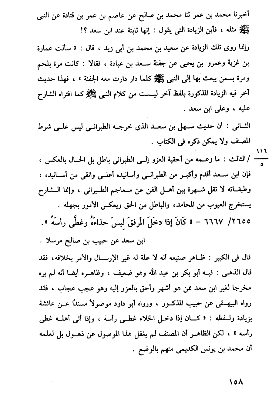 الثالث: ما زعمه من أحقية العزو إلى الطبرانى باطل بل الحال بالعكس، فإن ابن سعد أقدم وكبر من الطبرانى وأسانيده أعلى وانقى من أسانيده، وطبقاته لا تقل شهرة بين أهل الفن عن معاجم الطبرانى، وإنما الشارح يستخرج العيوب من المحامد، والباطل من الحق ويعكس الأمور بجهله.