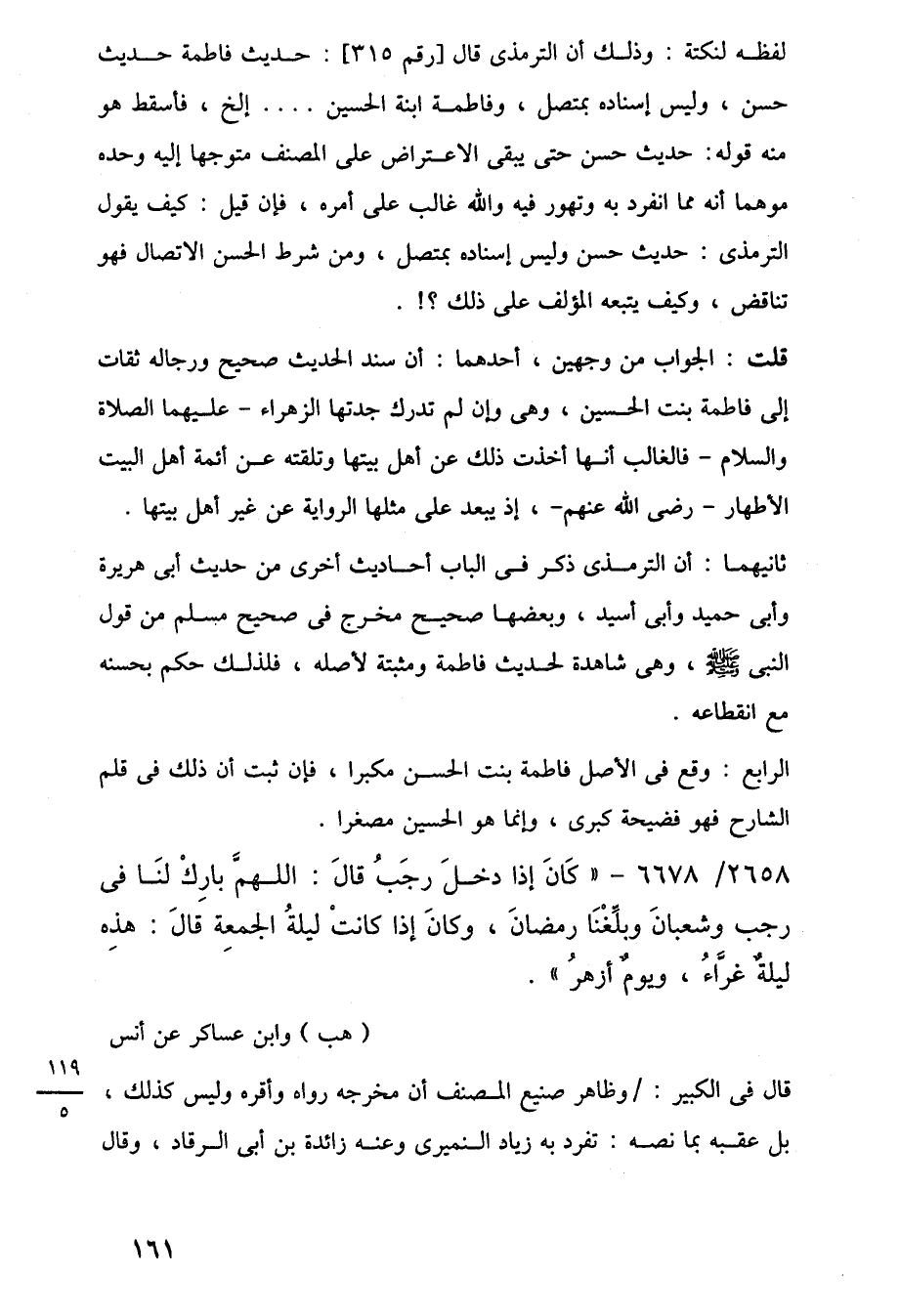 لفظه لنكتة: وذلك أن الترمذى قال [رقم 315]: حديث فاطمة حديث حسن، وليس إسناده بمتصل، وفاطمة ابنة الحسين. . . إلخ، فأسقط هو منه قوله: حديث حسن حتى يبقى الاعتراض على المصنف متوجها إليه وحده موهما أنه مما انفرد به وتهور فيه واللَّه غالب على أمره، فإن قيل: كيف يقول الترمذى: حديث حسن وليس إسناده بمتصل، ومن شرط الحسن الاتصال فهو تناقض، وكيف يتبعه المؤلف على ذلك؟!.