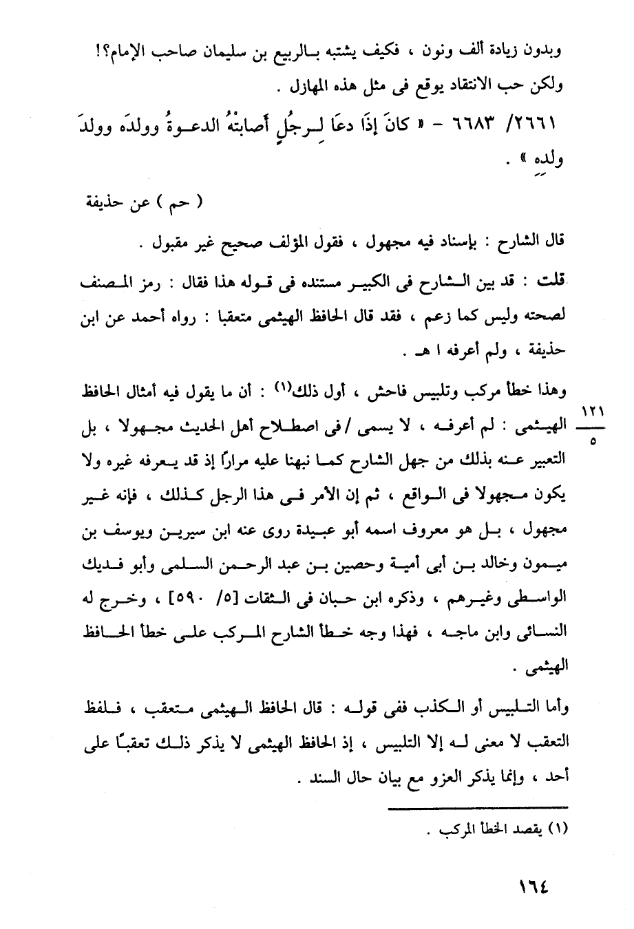 وهذا خطأ مركب وتلبيس فاحش، أول ذلك (¬1): أن ما يقول فيه أمثال الحافظ الهيثمى: لم أعرفه، لا يسمى في اصطلاح أهل الحديث مجهولا، بل التعبير عنه بذلك من جهل الشارح كما نبهنا عليه مرارًا إذ قد يعرفه غيره ولا يكون مجهولا في الواقع، ثم إن الأمر في هذا الرجل كذلك، فإنه غير مجهول، بل هو معروف اسمه أبو عبيدة روى عنه ابن سيرين ويوسف بن ميمون وخالد بن أبي أمية وحصين بن عبد الرحمن السلمى وأبو فديك الواسطى وغيرهم، وذكره ابن حبان في الثقات [5/ 590]، وخرج له النسائى وابن ماجه، فهذا وجه خطأ الشارح المركب على خطأ الحافظ الهيثمى.