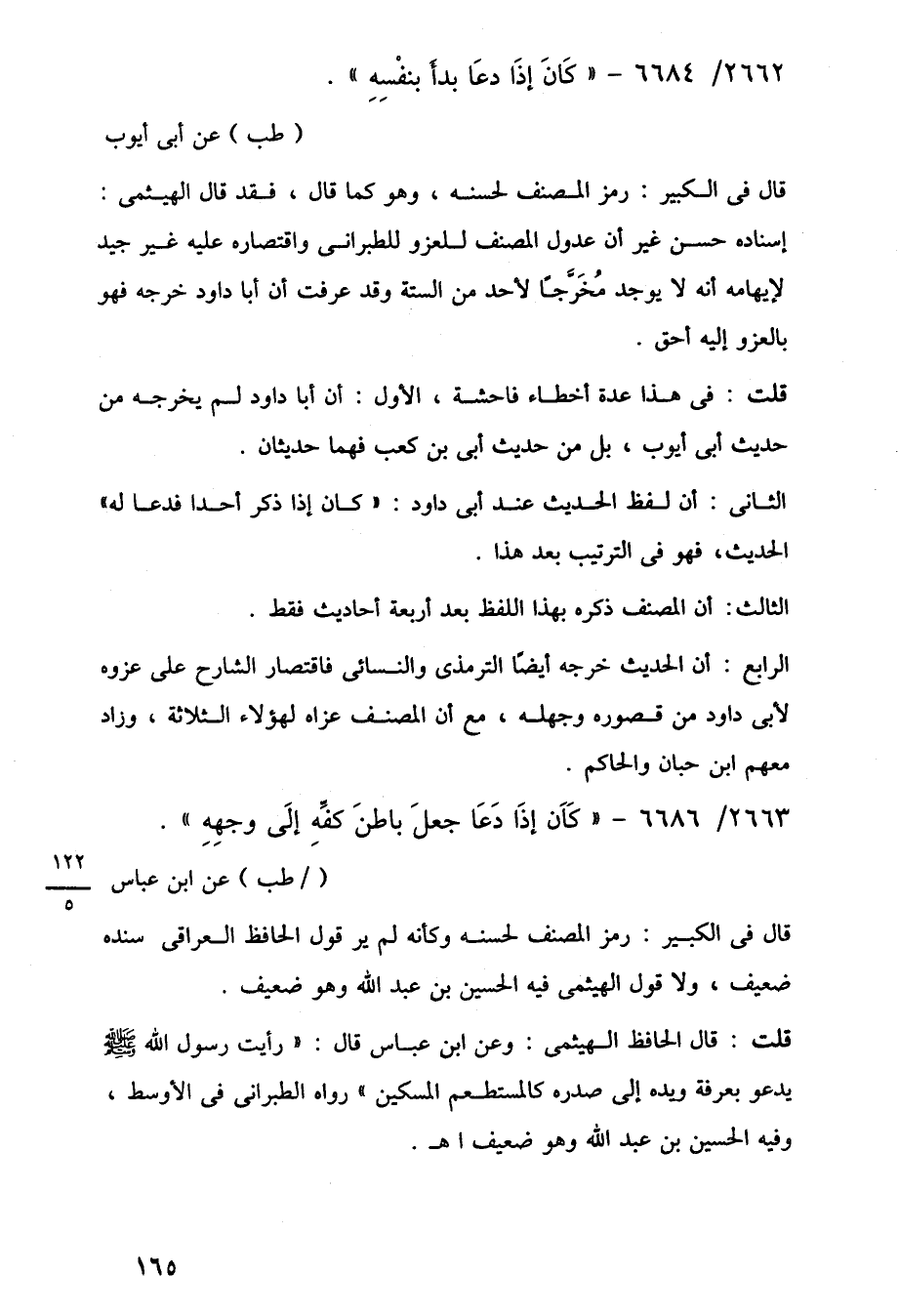 قلت: قال الحافظ الهيثمى: وعن ابن عباس قال: "رأيت رسول اللَّه -صلى اللَّه عليه وسلم- يدعو بعرفة ويده إلى صدره كالمستطعم المسكين" رواه الطبرانى في الأوسط، وفيه الحسين بن عبد اللَّه وهو ضعيف اهـ.