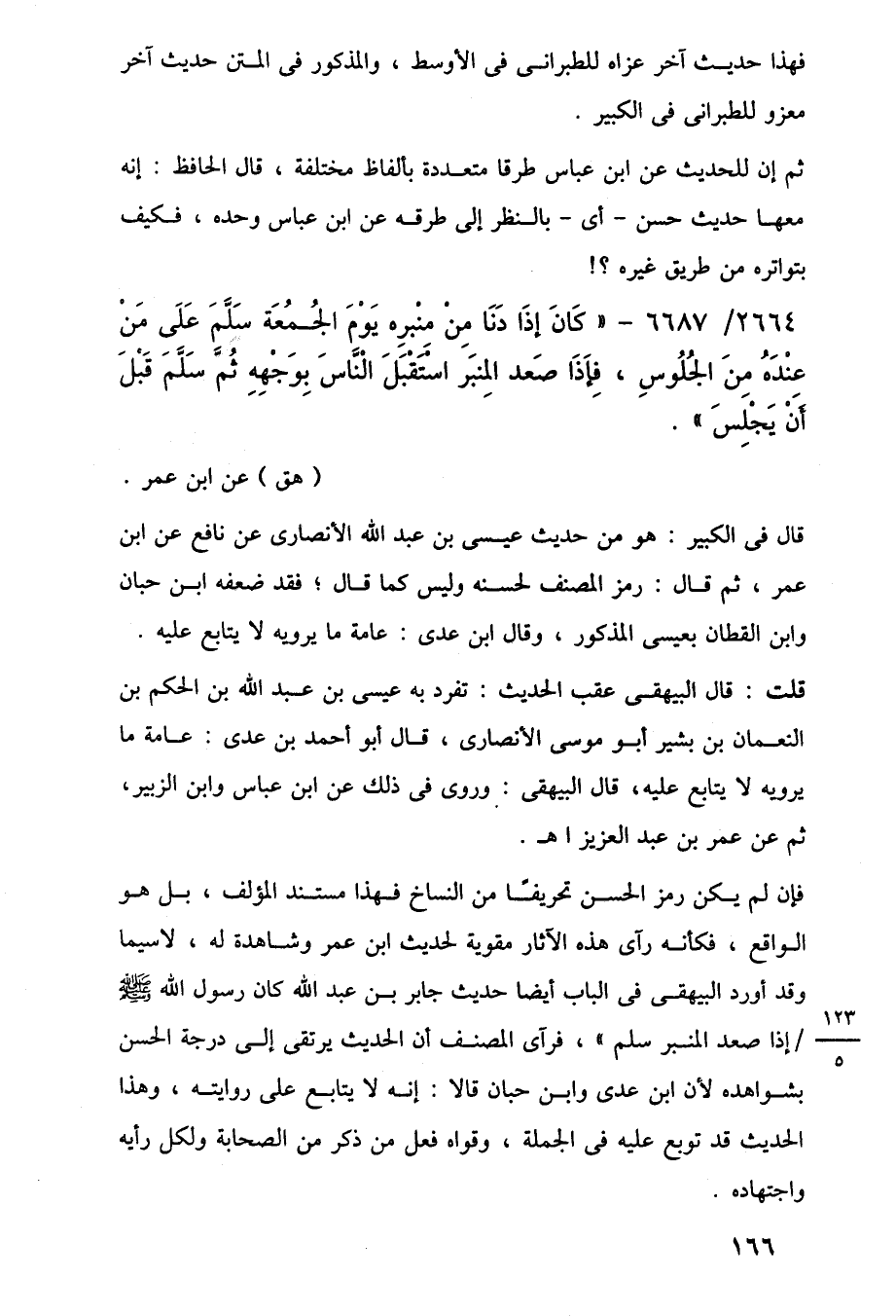 فإن لم يكن رمز الحسن تحريفًا من النساخ فهذا مستند المؤلف، بل هو الواقع، فكأنه رآى هذه الآثار مقوية لحديث ابن عمر وشاهدة له، لاسيما وقد أورد البيهقى في الباب أيضًا حديث جابر بن عبد اللَّه كان رسول اللَّه -صلى اللَّه عليه وسلم- إذا صعد المنبر سلم"، فرآى المصنف أن الحديث يرتقى إلى درجة الحسن بشواهده لأن ابن على وابن حبان قال: إنه لا يتابع على روايته، وهذا الحديث قد توبع عليه في الجملة، وقواه فعل من ذكر من الصحابة ولكل رأيه واجتهاده.