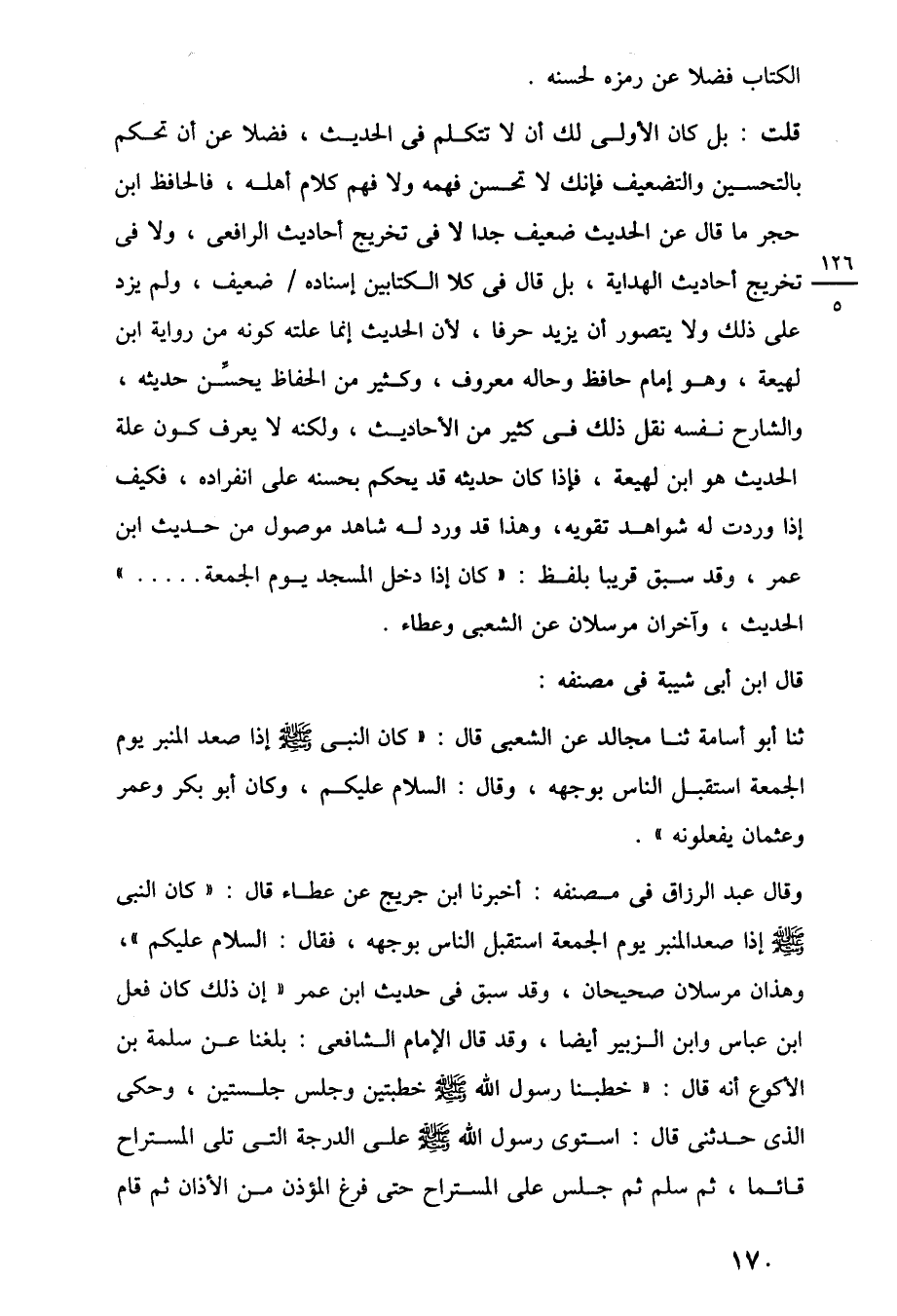 قلت: بل كان الأولى لك أن لا تتكلم في الحديث، فضلا عن أن تحكم بالتحسين والتضعيف فإنك لا تحسن فهمه ولا فهم كلام أهله، فالحافظ ابن حجر ما قال عن الحديث ضعيف جدا لا في تخريج أحاديث الرافعى، ولا في تخريج أحاديث الهداية، بل قال في كلا الكتابين إسناده ضعيف، ولم يزد على ذلك ولا يتصور أن يزيد حرفا، لأن الحديث إنما علته كونه من رواية ابن لهيعة، وهو إمام حافظ وحاله معروف، وكثير من الحفاظ يحسِّن حديثه، والشارح نفسه نقل ذلك في كثير من الأحاديث، ولكنه لا يعرف كون علة الحديث هو ابن لهيعة، فإذا كان حديثه قد يحكم بحسنه على انفراده، فكيف إذا وردت له شواهد تقويه، وهذا قد ورد له شاهد موصول من حديث ابن عمر، وقد سبق قريبًا بلفظ: "كان إذا دخل المسجد يوم الجمعة. . . " الحديث، وآخران مرسلان عن الشعبى وعطاء.