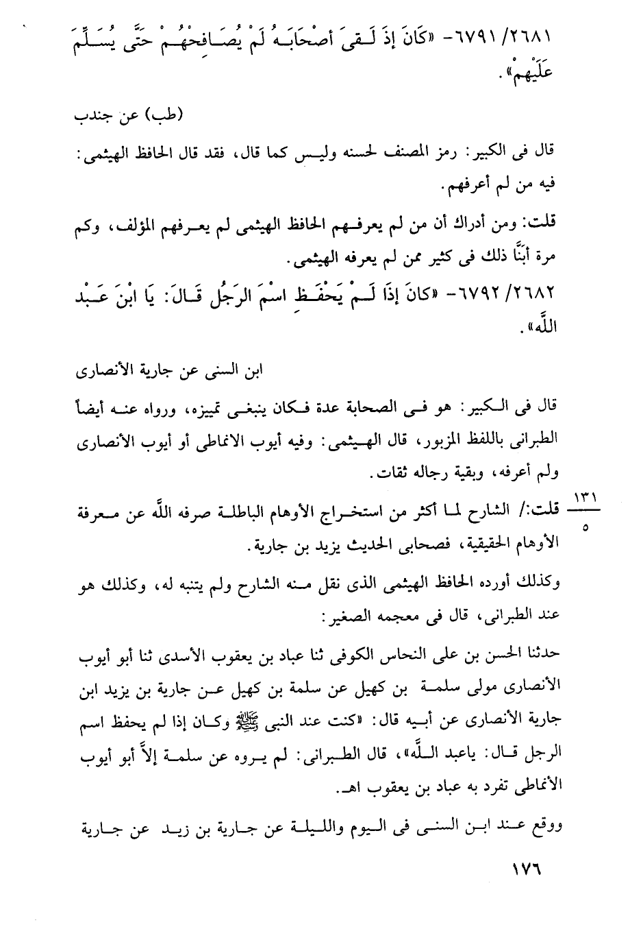 حدثنا الحسن بن على النحاس الكوفى ثنا عباد بن يعقوب الأسدى ثنا أبو أيوب الأنصارى مولى سلمة بن كهيل عن سلمة بن كهيل عن جارية بن يزيد ابن جارية الأنصارى عن أبيه قال: "كنت عند النبي -صلى اللَّه عليه وسلم- وكان إذا لم يحفظ اسم الرجل قال: يا عبد اللَّه"، قال الطبرانى: لم يروه عن سلمة إلَّا أبو أيوب الأنماطى تفرد به عباد بن يعقوب اهـ.