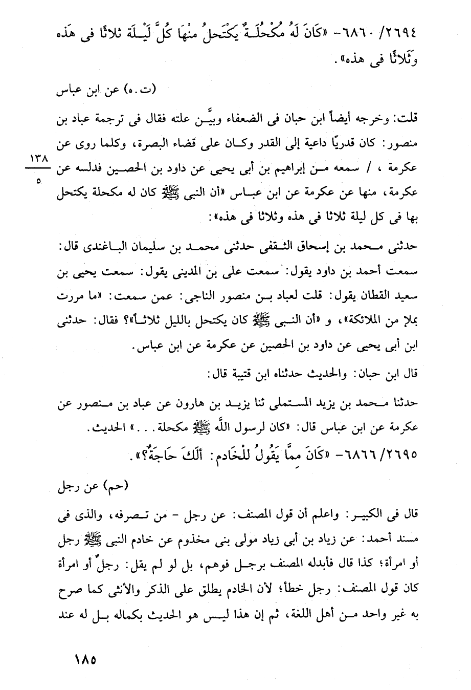 حدثنى محمد بن إسحاق الثقفى حدثنى محمد بن سليمان الباغندى قال: سمعت أحمد بن داود يقول: سمعت على بن المدينى يقول: سمعت يحيى بن سعيد القطان يقول: قلت لعباد بن منصور الناجى: عمن سمعت: "ما مررت بملإ من الملائكة"، و"أن النبي -صلى اللَّه عليه وسلم- كان يكتحل بالليل ثلاثًا"؟ فقال: حدثنى ابن أبي يحيى عن داود بن الحصين عن عكرمة عن ابن عباس.