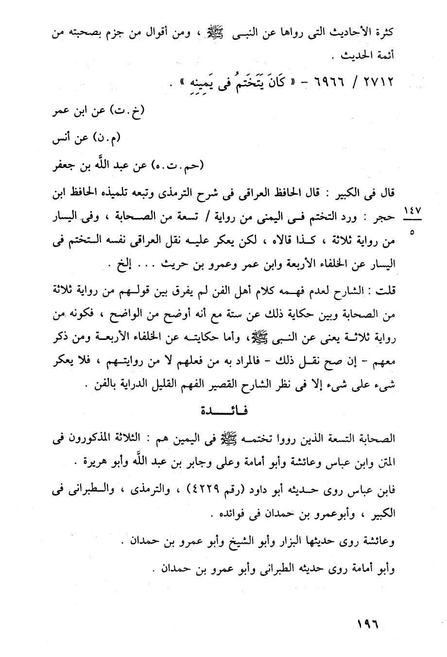 قال في الكبير: قال الحافظ العراقى في شرح الترمذى وتبعه تلميذه الحافظ ابن حجر: ورد التختم في اليمنى من رواية تسعة من الصحابة، وفي اليسار من رواية ثلاثة، كذا قالاه، لكن يعكر عليه نقل العراقى نفسه التختم في اليسار عن الخلفاء الأربعة وابن عمر وعمرو بن حريث. . . إلخ.