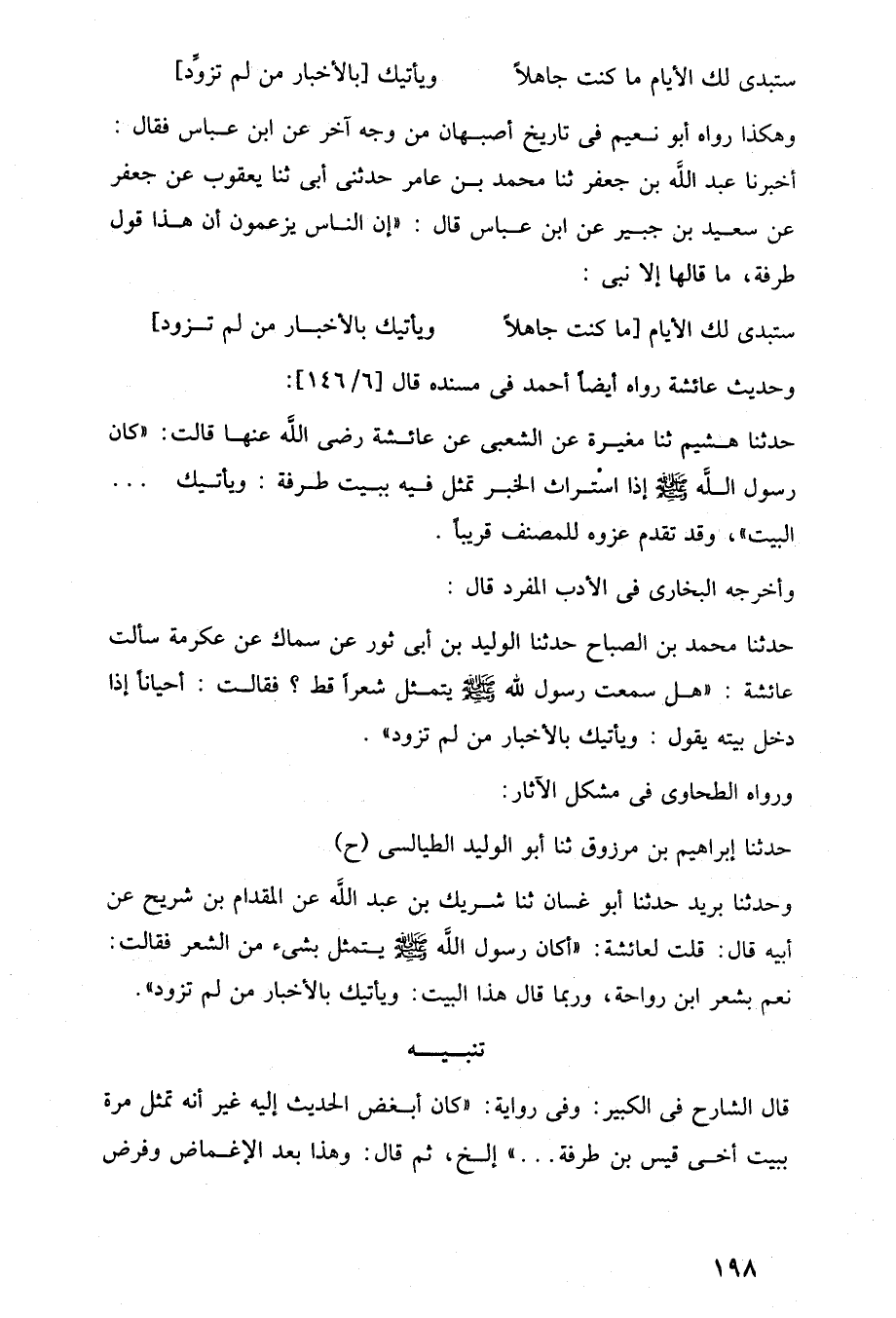 حدثنا هشيم ثنا مغيرة عن الشعبى عن عائشة رضي اللَّه عنها قالت: "كان رسول اللَّه -صلى اللَّه عليه وسلم- إذا اسْتراث الخبر تمثل فيه ببيت طرفة: ويأتيك. . . البيت"، وقد تقدم عزوه للمصنف قريبًا.
