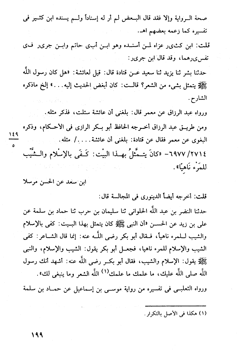 حدثنا النضر بن عبد اللَّه الحلوانى ثنا سليمان بن حرب ثنا حماد بن سلمة عن على بن زيد عن الحسن "أن النبي -صلى اللَّه عليه وسلم- كان يتمثل بهذا البيت: كفى بالإسلام والشيب للمرء ناهيًا، فقال أبو بكر رضي اللَّه عنه: إنما قال الشاعر: كفى الشيب والإسلام للمرء ناهيا، فجعل أبو بكر يقول: الشيب والإسلام، والنبى -صلى اللَّه عليه وسلم- يقول: الإسلام والشيب، فقال أبو بكر رضي اللَّه عنه: أشهد أنك رسول اللَّه صلى اللَّه عليك، ما علمك ما علمك (¬1) اللَّه الشعر وما ينبغى لك".