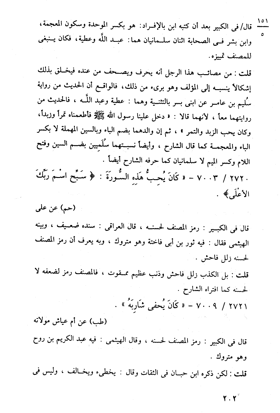 قلت: من مصائب هذا الرجل أنه يحرف ويصحف من عنده فيخلق بذلك إشكالًا ينسبه إلى المؤلف وهو برئ من ذلك، فالواقع أن الحديث من رواية سُليم بن عامر عن ابنى بسر بالتثنية وهما: عطية وعبد اللَّه، فالحديث من روايتهما معًا، لأنهما قالا: "دخل علينا رسول اللَّه -صلى اللَّه عليه وسلم- فأطعمناه تمرًا وزبدًا، وكان يحب الزبد والتمر"، ثم إن والدهما بضم الباء وبالسين المهملة لا بكسر الباء والمعجمة كما قال الشارح، وأيضًا نسبتهما سُلَمِيين بضم السين وفتح اللام وكسر الميم لا سلمانيان كما حرفه الشارح أيضًا.