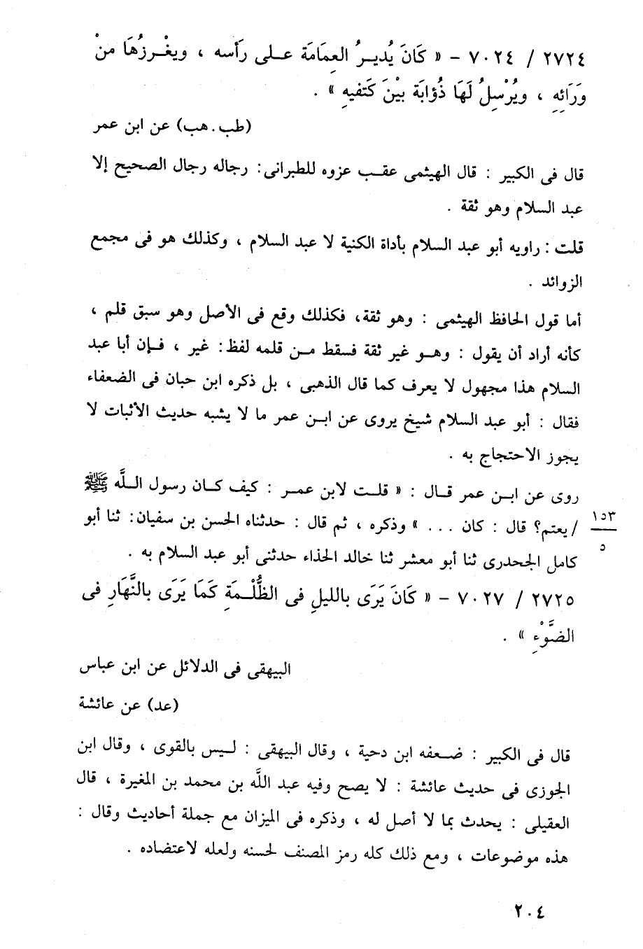 أما قول الحافظ الهيثمى: وهو ثقة، فكذلك وقع في الأصل وهو سبق قلم، كأنه أراد أن يقول: وهو غير ثقة فسقط من قلمه لفظ: غير، فإن أبا عبد السلام هذا مجهول لا يعرف كما قال الذهبى، بل ذكره ابن حبان في الضعفاء فقال: أبو عبد السلام شيخ يروى عن ابن عمر ما لا يشبه حديث الأثبات لا يجوز الاحتجاج به.
