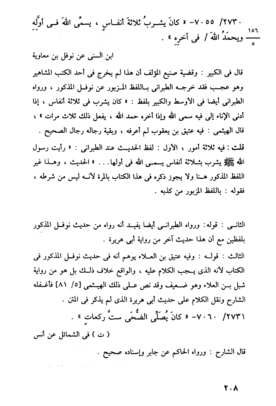 قال في الكبير: وقضية صنيع المؤلف أن هذا لم يخرج في أحد الكتب المشاهير وهو عجب فقد خرجه الطبرانى باللفظ المزبور عن نوفل المذكور، ورواه الطبرانى أيضًا في الأوسط والكبير بلفظ: "كان يشرب في ثلاثة أنفاس، إذا أدنى الإناء إلى فيه سمى اللَّه وإذا أخره حمد اللَّه، يفعل ذلك ثلاث مرات"، قال الهيثمى: فيه عتيق بن يعقوب لم أعرفه، وبقية رجاله رجال الصحيح.
