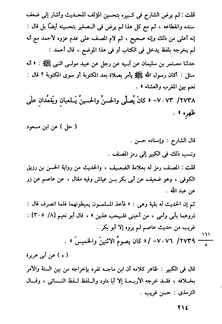 2738/ 7073 - "كانَ يُصلِّى والحسنُ والحسينُ يَلعبانِ ويَقعُدانِ علَى ظهرِه".
