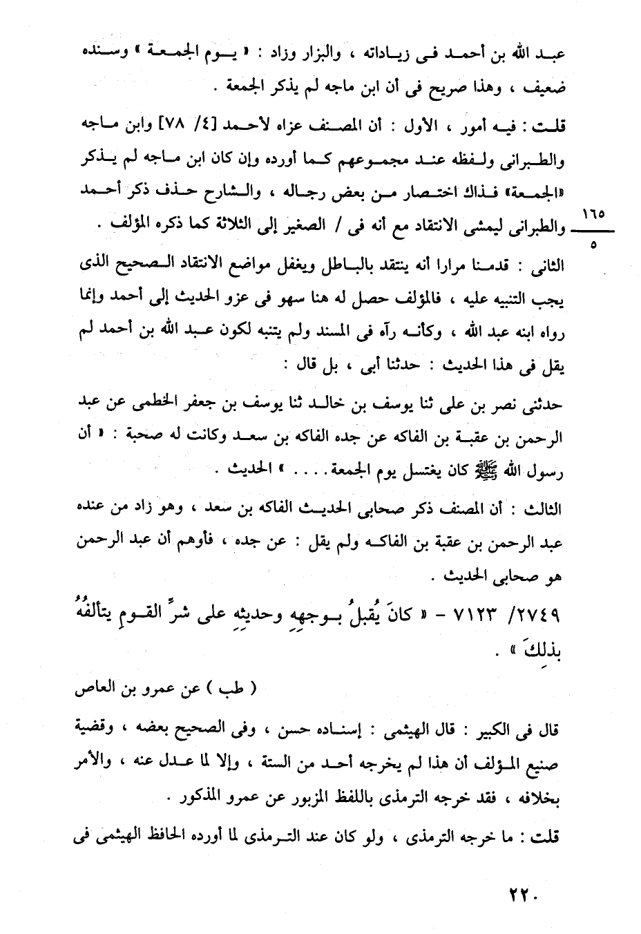 الثانى: قدمنا مرارا أنه ينتقد بالباطل ويغفل مواضع الانتقاد الصحيح الذي يجب التنبيه عليه، فالمؤلف حصل له هنا سهو في عزو الحديث إلى أحمد وإنما رواه ابنه عبد اللَّه، وكأنه رآه في المسند ولم يتنبه لكون عبد اللَّه بن أحمد لم يقل في هذا الحديث: حدثنا أبي، بل قال: