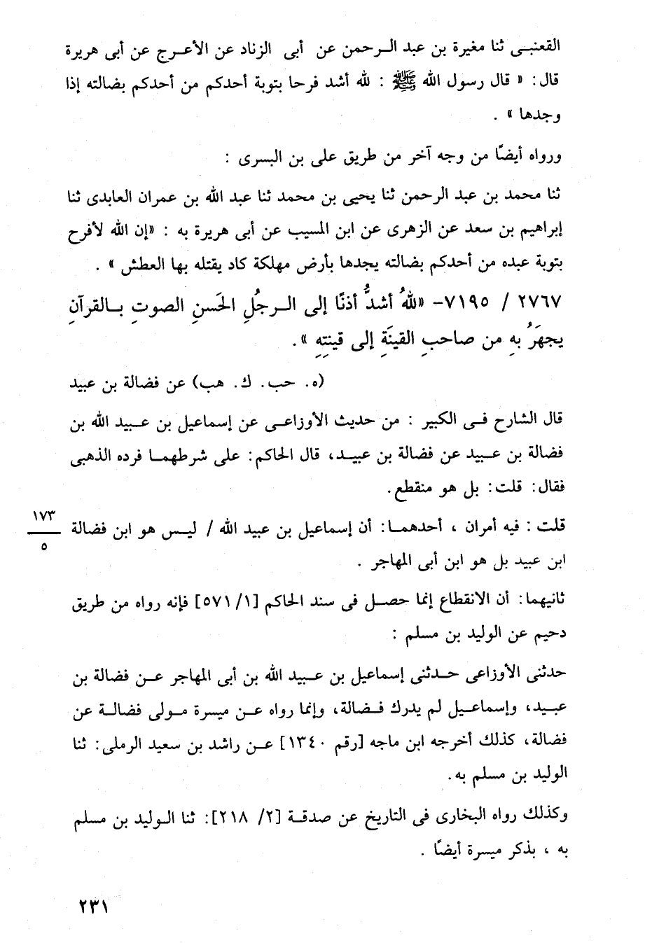 القعنبى ثنا مغيرة بن عبد الرحمن عن أبي الزناد عن الأعرج عن أبي هريرة قال: "قال رسول اللَّه -صلى اللَّه عليه وسلم-: للَّه أشد فرحا بتوبة أحدكم من أحدكم بضالته إذا وجدها".