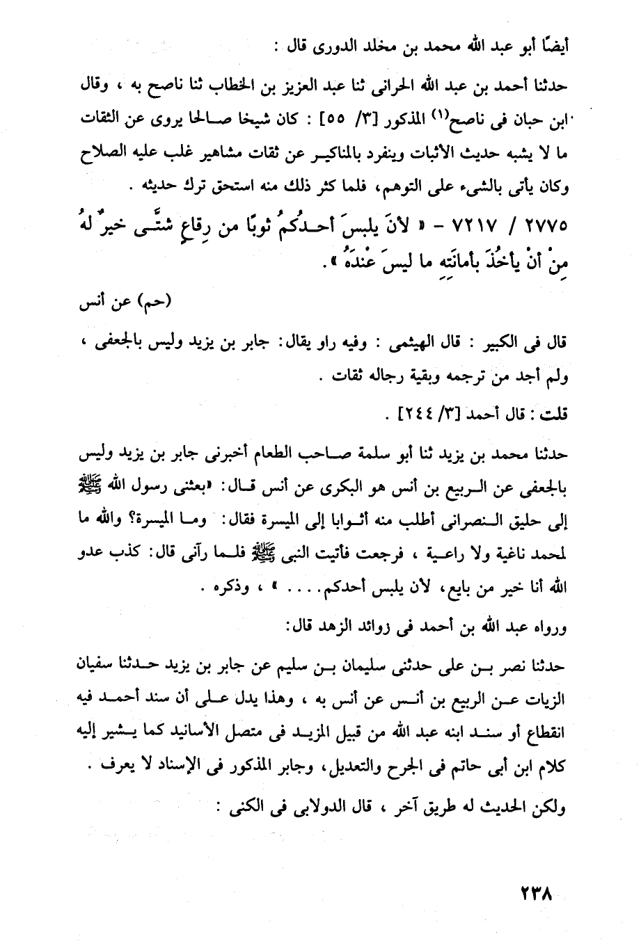 حدثنا نصر بن على حدثنى سليمان بن سليم عن جابر بن يزيد حدثنا سفيان الزيات عن الربيع بن أنس عن أنس به، وهذا يدل على أن سند أحمد فيه انقطاع أو سند ابنه عبد اللَّه من قبيل المزيد في متصل الأسانيد كما يشير إليه كلام ابن أبي حاتم في الجرح والتعديل، وجابر المذكور في الإسناد لا يعرف.