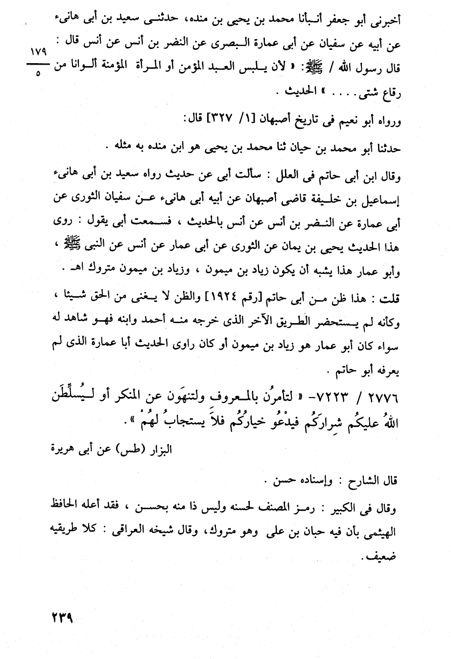 وقال ابن أبي حاتم في العلل: سألت أبي عن حديث رواه سعيد بن أبي هانئ إسماعيل بن خليفة قاضى أصبهان عن أبيه أبي هانئ عن سفيان الثورى عن أبي عمارة عن النضر بن أنس عن أنس بالحديث، فسمعت أبي يقول: روى هذا الحديث يحيى بن يمان عن الثورى عن أبي عمار عن أنس عن النبي -صلى اللَّه عليه وسلم-، وأبو عمار هذا يشبه أن يكون زياد بن ميمون، وزياد بن ميمون متروك اهـ.