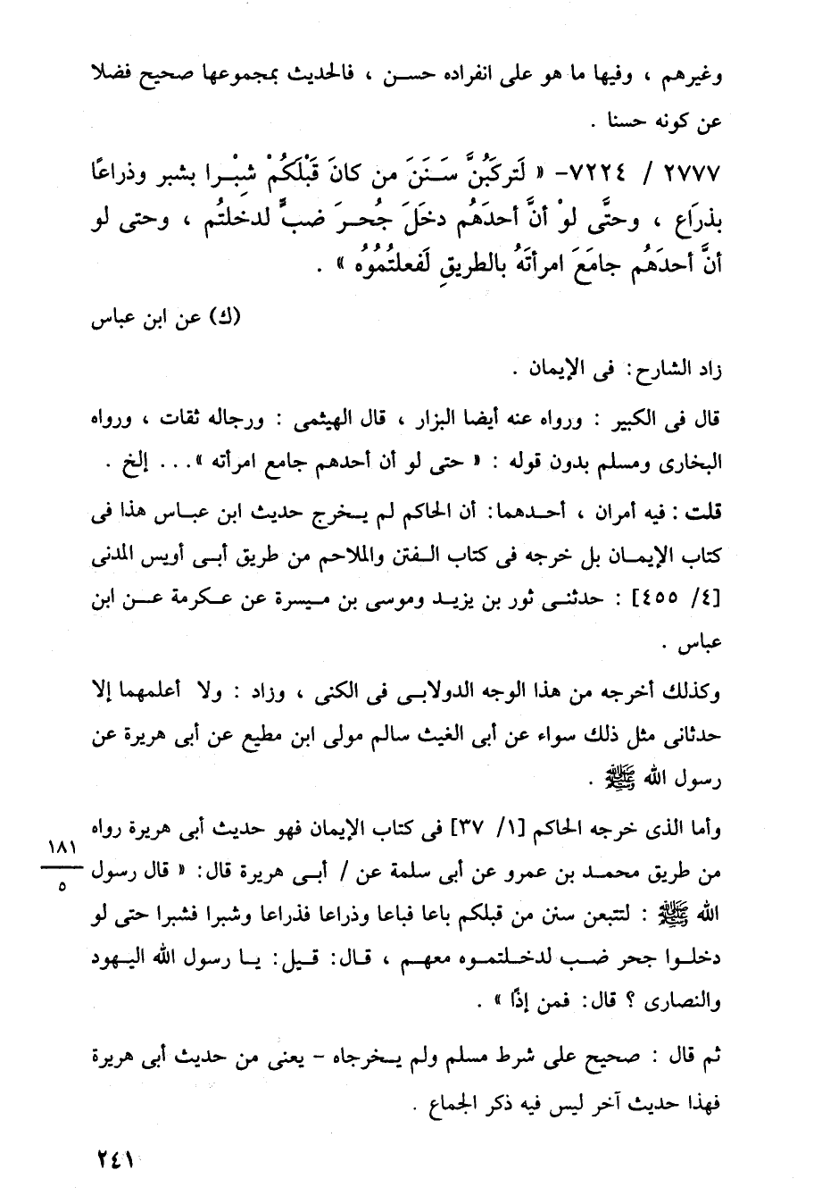 2777/ 7224 - "لَتركَبُنَّ سَنَنَ من كانَ قَبْلكُمْ شبْرا بشبر وذراعًا بذرَاع، وحتَّى لوْ أنَّ أحدَهُم دخَلَ جُحرَ ضبٍّ لدخَلتُم، وحتى لو أنَّ أحدَهُم جامَعَ امرأتَهُ بالطريقِ لَفعلتُمُوُه".