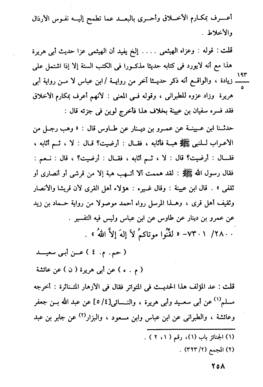 حدثنا ابن عيينة عن عمرو بن دينار عن طاوس قال: "وهب رجل من الأعراب للنبي -صلى اللَّه عليه وسلم- هبة فأثابه، فقال: أرضيت؟ قال: لا، ثم أثابه، فقال: أرضيت؟ قال: لا، ثم أثابه، فقال: أرضيت؟، قال: نعم: فقال رسول اللَّه -صلى اللَّه عليه وسلم-: لقد هممت ألا أتهب هبة إلا من قرشى أو أنصارى أو ثقفى". قال ابن عيينة: وقال غيره: هؤلاء أهل القرى لأن قريشا والأنصار وثقيف أهل قرى، وهذا المرسل رواه أحمد موصولا من رواية حماد بن زيد عن عمرو بن دينار عن طاوس عن ابن عباس وليس فيه التفسير.