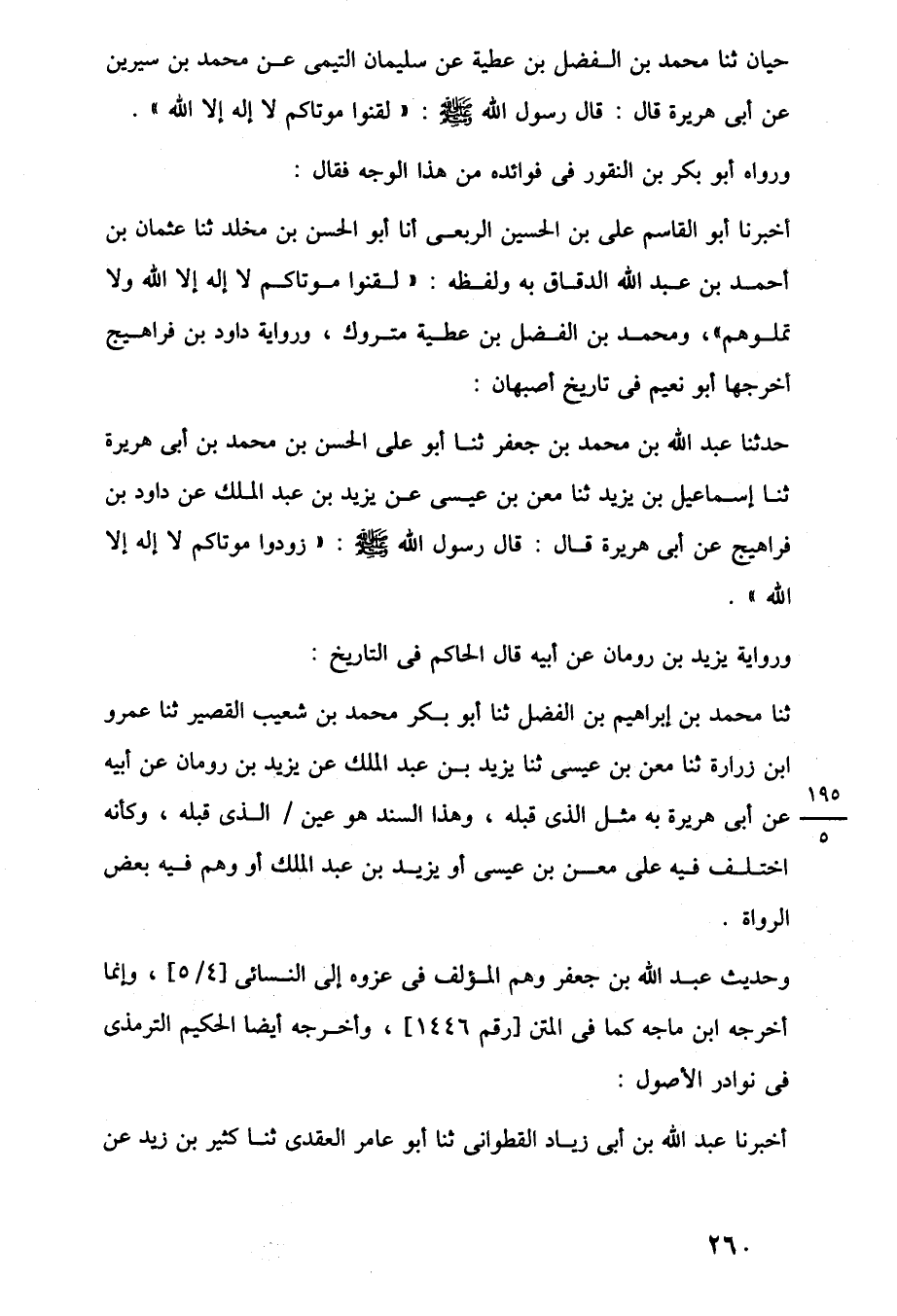 حيان ثنا محمد بن الفضل بن عطية عن سليمان التيمى عن محمد بن سيرين عن أبي هريرة قال: قال رسول اللَّه -صلى اللَّه عليه وسلم-: "لقنوا موتاكم لا إله إلا اللَّه".