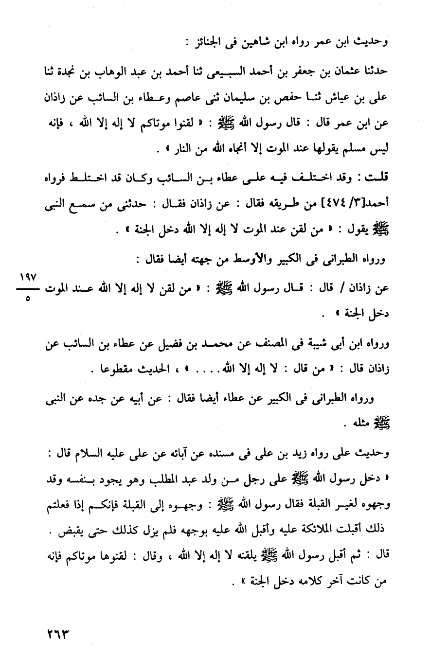 وحديث على رواه زيد بن على في مسنده عن آبائه عن على عليه السلام قال: "دخل رسول اللَّه -صلى اللَّه عليه وسلم- على رجل من ولد عبد المطلب وهو يجود بنفسه وقد وجهوه لغير القبلة فقال رسول اللَّه -صلى اللَّه عليه وسلم-: وجهوه إلى القبلة فإنكم إذا فعلتم ذلك أقبلت الملائكة عليه وأقبل اللَّه عليه بوجهه فلم يزل كذلك حتى يقبض. قال: ثم أقبل رسول اللَّه -صلى اللَّه عليه وسلم- يلقنه لا إله إلا اللَّه، وقال: لقنوها موتاكم فإنه من كانت آخر كلامه دخل الجنة".