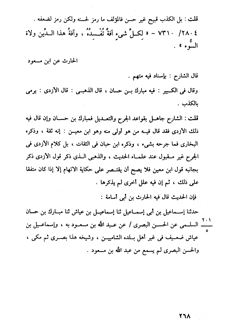 قلت: الشارح جاهل بقواعد الجرح والتعديل فمبارك بن حسان وإن قال فيه ذلك الأزدى فقد قال فيه من هو أولى منه وهو ابن معين: إنه ثقة، وذكره البخارى فما جرحه بشيء، وذكره ابن حبان في الثقات، بل كلام الأزدى في الجرح غير مقبول عند علماء الحديث، والذهبى الذي ذكر قول الأزدى ذكر بجانبه قول ابن معين فلا يصح أن يقتصر على حكاية الاتهام إلا إذا كان متفقا على ذلك، ثم إن فيه علل أخرى لم يذكرها.