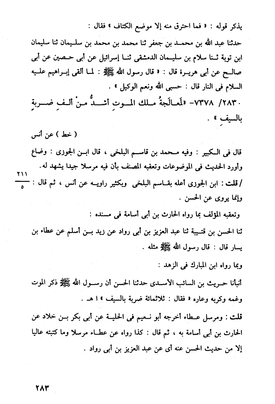 أنبأنا حريث بن السائب الأسدى حدثنا الحسن أن رسول اللَّه -صلى اللَّه عليه وسلم- ذكر الموت وغمه وكربه وعاره "فقال: ثلاثمائة ضربة بالسيف" اهـ.