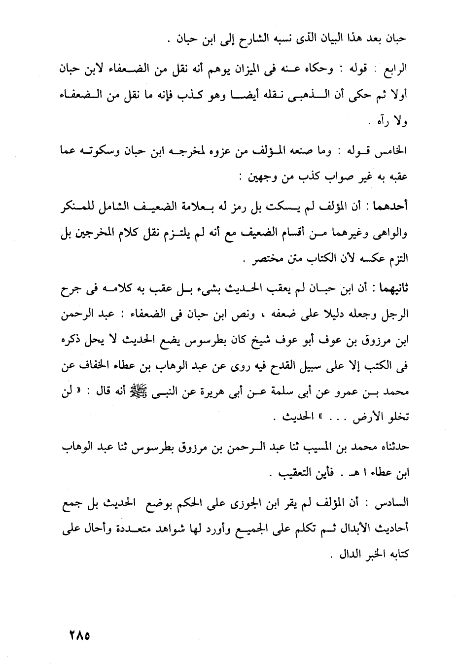 ثانيهما: أن ابن حبان لم يعقب الحديث بشيء بل عقب به كلامه في جرح الرجل وجعله دليلا على ضعفه، ونص ابن حبان في الضعفاء: عبد الرحمن ابن مرزوق بن عوف أبو عوف شيخ كان بطرسوس يضع الحديث لا يحل ذكره في الكتب إلا على سبيل القدح فيه روى عن عبد الوهاب بن عطاء الخفاف عن محمد بن عمرو عن أبي سلمة عن أبي هريرة عن النبي -صلى اللَّه عليه وسلم- أنه قال: "لن تخلو الأرض. . . " الحديث.