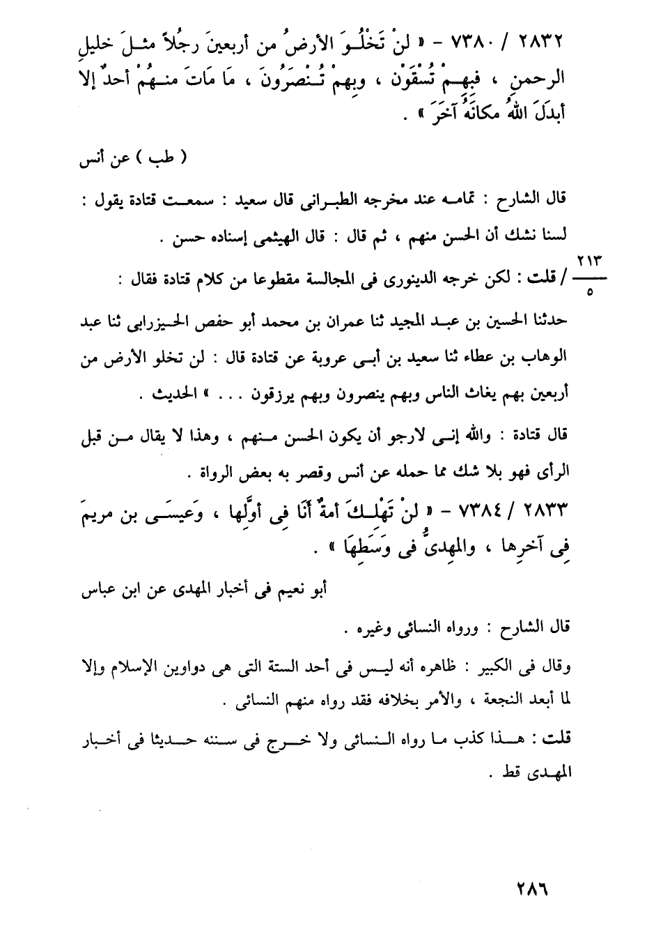 2832/ 7380 - "لنْ تَخْلُوَ الأرضُ من أربعينَ رجُلًا مثلَ خليلِ الرحمنِ، فبِهِمْ تُسْقَوْن، وبِهمْ تُنْصَرُونَ، مَا مَاتَ منهُمْ أحدٌ إلا أبدَلَ اللَّهُ مكانَهُ آخَرَ".