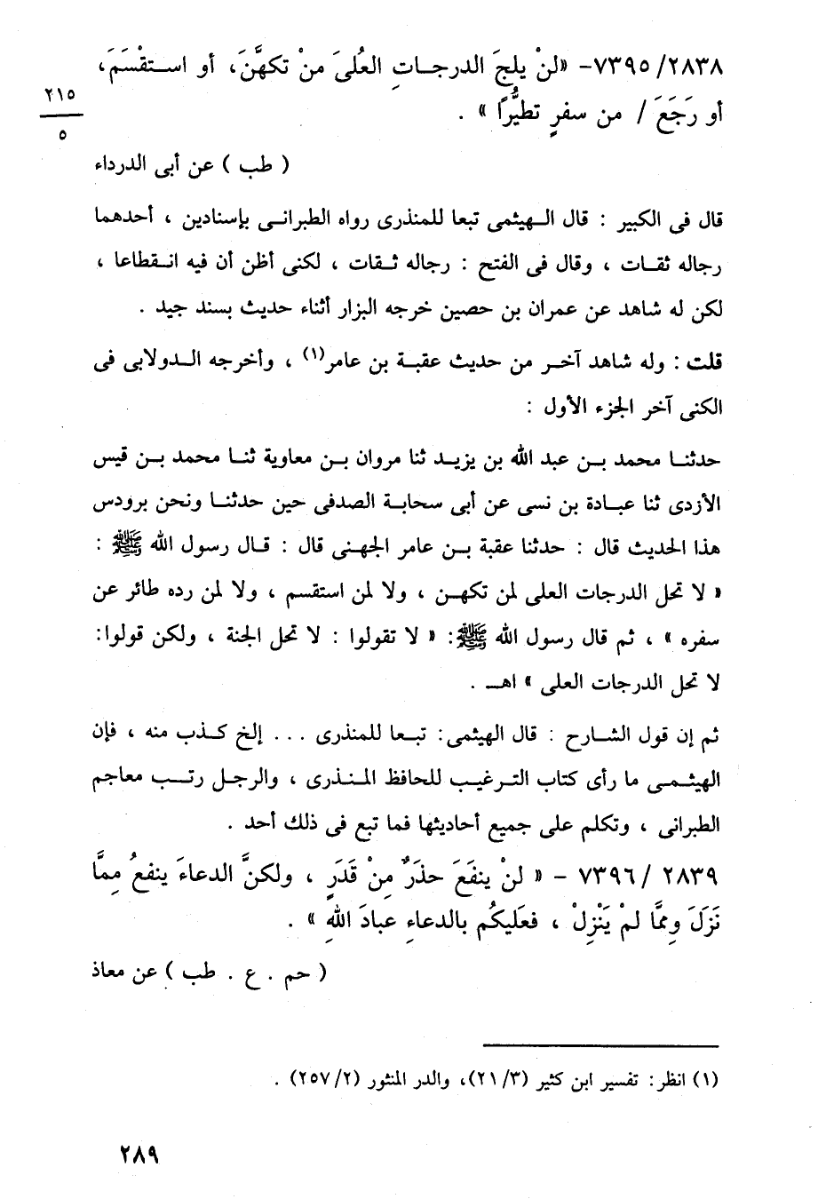 2838/ 7395 - "لنْ يلجَ الدرجاتِ العُلى منْ تكهَّنَ، أو استقْسَمَ، أو رَجَعَ من سفرٍ تطيُّرًا".
