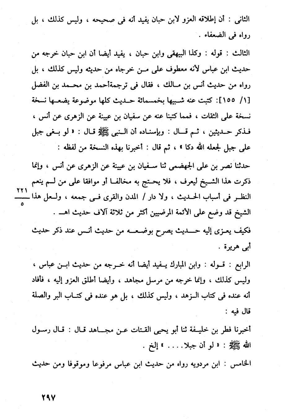 الثالث: قوله: وكذا البيهقى وابن حبان، يفيد أيضًا أن ابن حبان خرجه من حديث ابن عباس لأنه معطوف على من خرجاه من حديثه وليس كذلك، بل رواه من حديث أنس بن مالك، فقال في ترجمة أحمد بن محمد بن الفضل [1/ 155]: كتبت عنه شبيها بخمسمائة حديث كلها موضوعة يضعها نسخة نسخة على الثقات، فمما كتبنا عنه عن سفيان بن عيينة عن الزهرى عن أنس، فذكر حديثين، ثم قال: وبإسناده أن النبي -صلى اللَّه عليه وسلم- قال: "لو بغى جبل على جبل لجعله اللَّه دكا"، ثم قال: أخبرنا بهذه النسخة من لفظه: