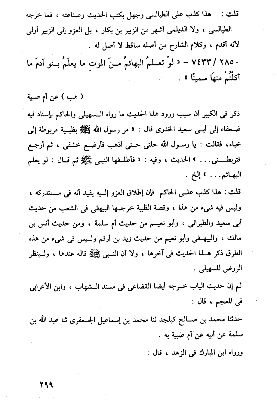 قلت: هذا كذب على الحاكم فإن إطلاق العزو إليه يفيد أنه في مستدركه، وليس فيه شيء من هذا، وقصة الظبية خرجها البيهقى في الشعب من حديث أبي سعيد والطبرانى، وأبو نعيم من حديث أم سلمة، ومن حديث أنس بن مالك، والبيهقى وأبو نعيم من حديث زيد بن أرقم وليس في شيء من هذه الطرق ذكر هذا الحديث في آخرها، ولا أن النبي -صلى اللَّه عليه وسلم- قاله عندها، ولينظر الروض للسهيلى.