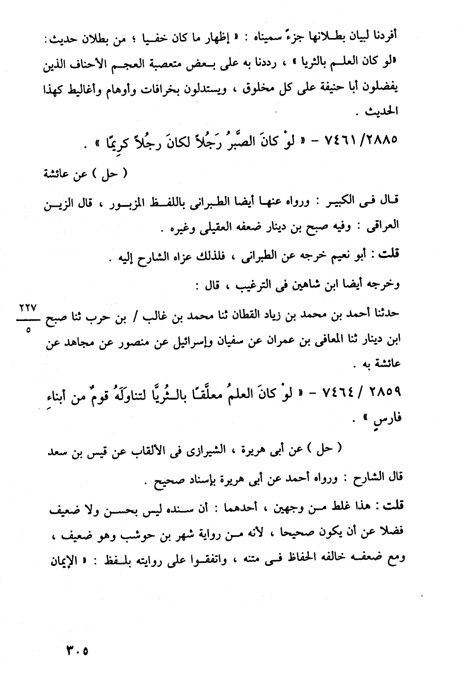أفردنا لبيان بطلانها جزءً سميناه: "إظهار ما كان خفيا؛ من بطلان حديث: "لو كان العلم بالثريا"، رددنا به على بعض متعصبة العجم الأحناف الذين يفضلون أبا حنيفة على كل مخلوق، ويستدلون بخرافات وأوهام وأغاليط كهذا الحديث.