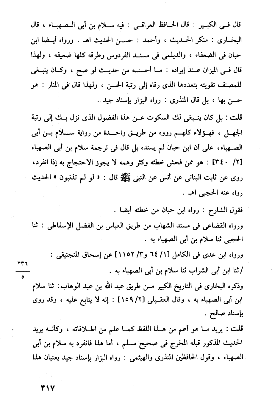 قلت: بل كان ينبغى لك السكوت عن هذا الفضول الذي نزل بك إلى رتبة الجهل، فهؤلاء كلهم رووه من طريق واحدة من رواية سلام بن أبي الصهباء، على أن ابن حبان لم يسنده بل قال في ترجمة سلام بن أبي الصهباء [2/ 340]: هو ممن فحش خطئه وكثر وهمه لا يجور الاحتجاج به إذا انفرد، روى عن ثابت البنانى عن أنس عن النبي -صلى اللَّه عليه وسلم- قال: "لو لم تذنبون" الحديث رواه عنه الحجبى اهـ.