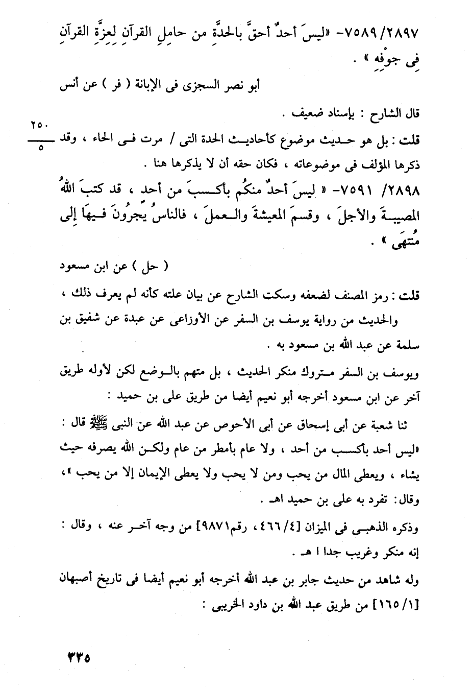 ثنا شعبة عن أبي إسحاق عن أبي الأحوص عن عبد اللَّه عن النبي -صلى اللَّه عليه وسلم- قال: "ليس أحد بأكسب من أحد، ولا عام بأمطر من عام ولكن اللَّه يصرفه حيث يشاء، ويعطى المال من يحب ومن لا يحب ولا يعطى الإيمان إلا من يحب"، وقال: تفرد به على بن حميد اهـ.
