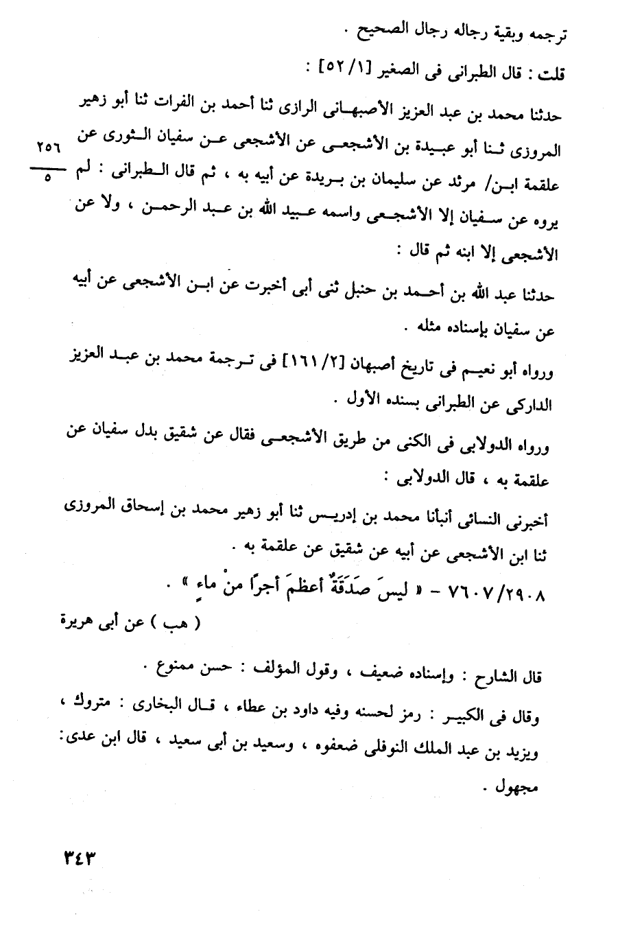 حدثنا محمد بن عبد العزيز الأصبهانى الرازى ثنا أحمد بن الفرات ثنا أبو زهير المروزى ثنا أبو عبيدة بن الأشجعى عن الأشجعى عن سفيان الثورى عن علقمة ابن مرثد عن سليمان بن بريدة عن أبيه به، ثم قال الطبرانى: لم يروه عن سفإن إلا الأشجعى واسمه عبيد اللَّه بن عبد الرحمن، ولا عن الأشجعى إلا ابنه ثم قال: