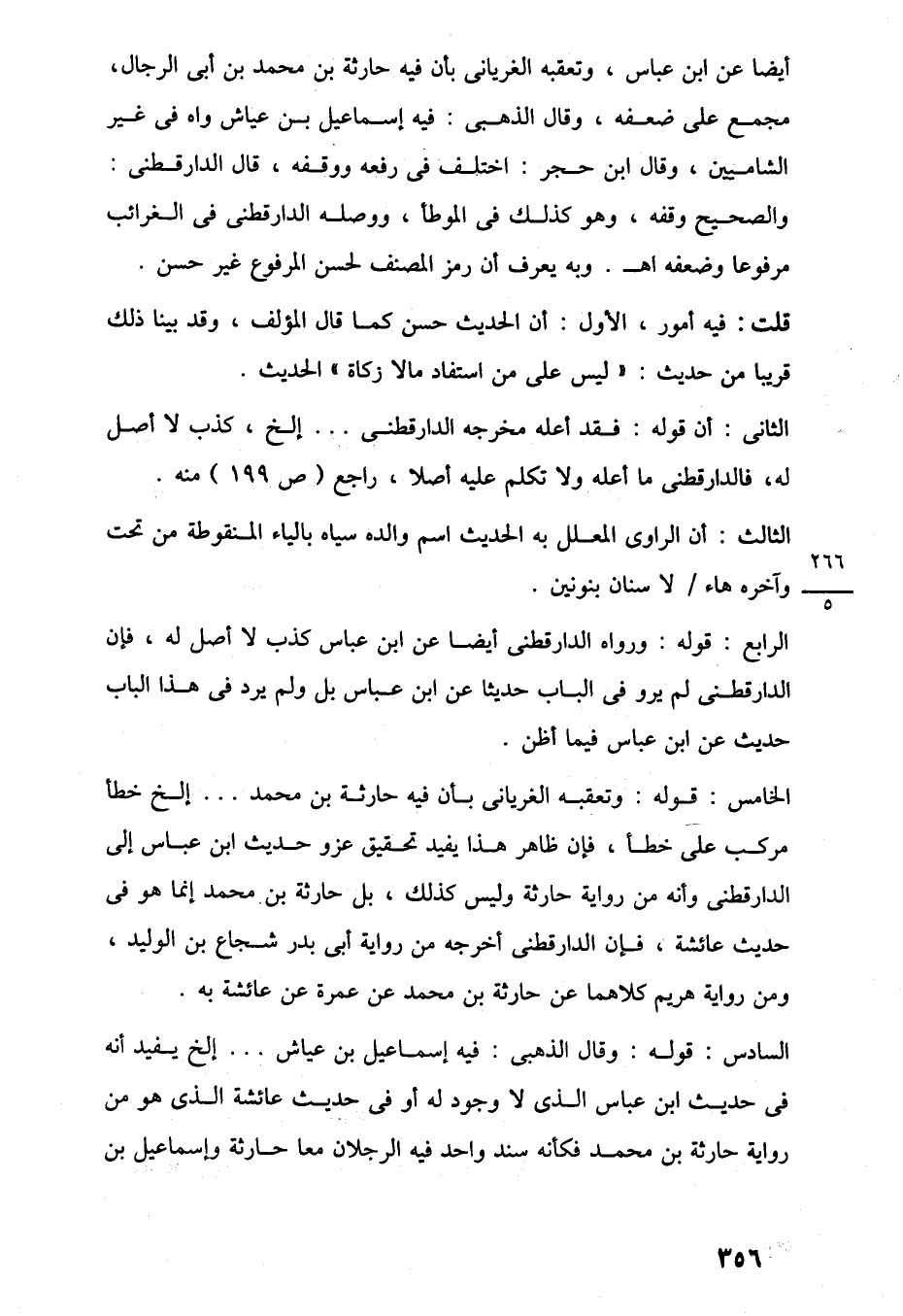 الخامس: قوله: وتعقبه الغريانى بأن فيه حارثة بن محمد. . . إلخ خطأ مركب على خطأ، فإن ظاهر هذا يفيد تحقيق عزو حديث ابن عباس إلى الدارقطنى وأنه من رواية حارثة وليس كذلك، بل حارثة بن محمد إنما هو في حديث عائشة، فإن الدارقطنى أخرجه من رواية أبي بدر شجاع بن الوليد، ومن رواية هريم كلاهما عن حارثة بن محمد عن عمرة عن عائشة به.