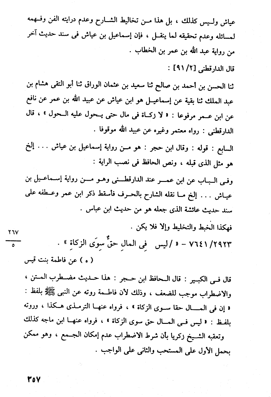ثنا الحسن بن أحمد بن صالح ثنا سعيد بن عثمان الوراق ثنا أبو التقى هشام بن عبد الملك ثنا بقية عن إسماعيل هو ابن عياش عن عبيد اللَّه بن عمر عن نافع عن ابن عمر مرفوعًا: "لا زكاة في مال حتى يحول عليه الحول"، قال الدارقطنى: رواه معتمر وغيره عن عبيد اللَّه موقوفًا.