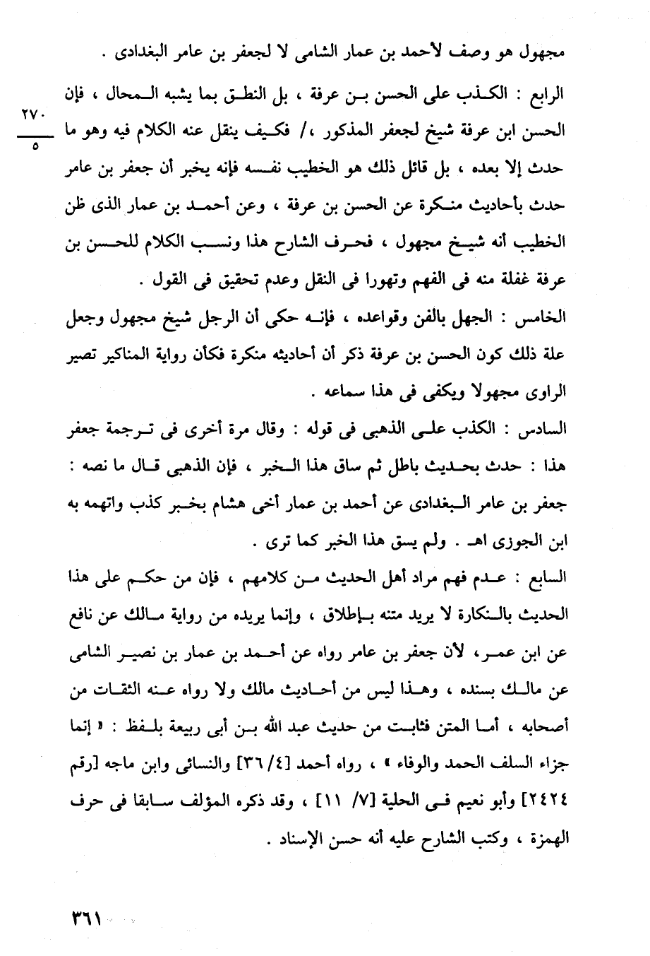 السادس: الكذب على الذهبى في قوله: وقال مرة أخرى في ترجمة جعفر هذا: حدث بحديث باطل ثم ساق هذا الخبر، فإن الذهبى قال ما نصه: جعفر بن عامر البغدادى عن أحمد بن عمار أخى هشام بخبر كذب واتهمه به ابن الجوزى اهـ. ولم يسق هذا الخبر كما ترى.