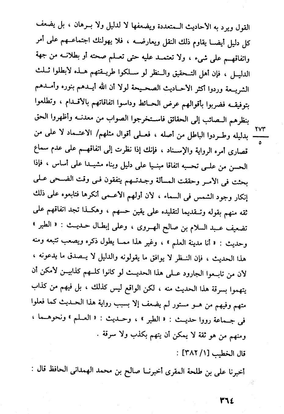 القول ويرد به الأحاديث المتعددة ويضعفها لا لدليل ولا برهان، بل يضعف كل دليل أيضًا يقاوم ذلك النقل ويعارضه، فلا يهولنك اجتماعهم على أمر واتفاقهم على شيء، ولا تعتمد عليه حتى تعلم صحته أو بطلانه من جهة الدليل، فإن أهل التحقيق والنظر لو سلكوا طريقتهم هذه لأبطلوا ثلث الشريعة وردوا أكثر الأحاديث الصحيحة لولا أن اللَّه أيدهم بنوره وأمدهم بتوفيقه فضربوا بأقوالهم عرض الحائط وداسوا اتفاقاتهم بالأقدام، وتطلعوا بنظرهم الصائب إلى الحقائق فاستخرجوا الصواب من معدنه وأظهروا الحق بدليله وطردوا الباطل من أصله، فعلى أقوال مثلهم الاعتماد لا على من قصارى أمره الرواية والإسناد، فإنك إذا نظرت إلى اتفاقهم على عدم سماع الحسن من على تحسبه اتفاقا مبنيا على دليل وبناء مشيدا على أساس، فإذا بحثت في الأمر وحققت المسألة وجدتهم يتفقون في وقت الضحى على إنكار وجود الشمس في السماء، لأن أولهم الأعمى أنكرها فتابعوه على ذلك ثقه منهم بقوله وتقديما لتقليده على يقين حسهم، وهكذا تجد اتفاقهم على تضعيف عبد السلام بن صالح الهروى، وعلى إبطال حديث: "الطير" وحديث: "أنا مدينة العلم"، وغير هذا مما يطول ذكره ويصعب تتبعه ومنه هذا الحديث، فإن النظر لا يوافق ما يقولونه والدليل لا يصدق ما يدعونه، لأن من تابعوا الجارود على هذا الحديث لو كانوا كلهم كذابين لأمكن أن يتهموا بسرقة هذا الحديث منه، لكن الواقع ليس كذلك، بل فيهم من كذاب متهم وفيهم من هو مستور لم يضعف إلا بسبب رواية هذا الحديث كما فعلوا في جماعة رووا حديث: "الطير"، وحديث: "العلم" ونحوهما، ومنهم من هو ثقة لا يمكن أن يتهم بكذب ولا سرقة.