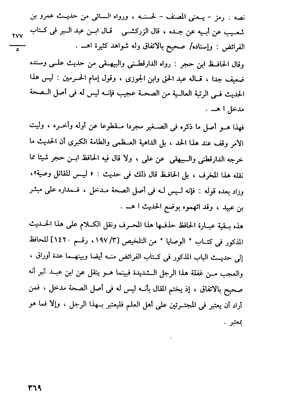 هذه بقية عبارة الحافظ حذفها هذا المحرف ونقل الكلام على هذا الحديث المذكور في كتاب "الوصايا" من التلخيص [3/ 197، رقم 1420] للحافظ إلى حديث الباب المذكور في كتاب الفرائض منه أيضًا وبينهما عدة أوراق، والعجب من غفلة هذا الرجل الشديدة فبينما هو ينقل عن ابن عبد البر أنه صحيح بالاتفاق، إذ يختم المقال بأنه ليس له في أصل الصحة مدخل، فمن أراد أن يعتبر في المجترئين على أهل العلم فليعتبر بهذا الرجل، وإلا فما هو بمعتبر.