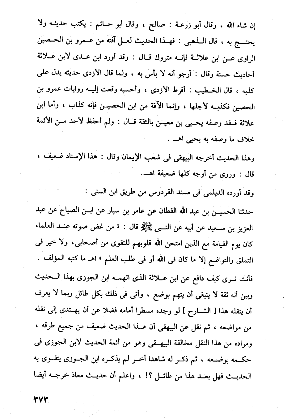 فأنت ترى كيف دافع عن ابن علاثة الذي اتهمه ابن الجوزى بهذا الحديث وبين أنه ثقة لا ينبغى أن يتهم بوضع، وأتى في ذلك بكل طائل وبما لا يعرف أن ينقله هذا [الشارح] لو وجده مسطرا أمامه فضلا عن أن يهتدى إلى نقله من مواضعه، ثم نقل عن البيهقى أن هذا الحديث ضعيف من جميع طرقه، ومراده من هذا النقل مخالفة البيهقى وهو من أئمة الحديث لابن الجوزى في حكمه بوضعه، ثم ذكر له شاهدا آخر لم يذكره ابن الجوزى يتقوى به الحديث فهل بعد هذا من طائل؟!، واعلم أن حديث معاذ خرجه أيضًا