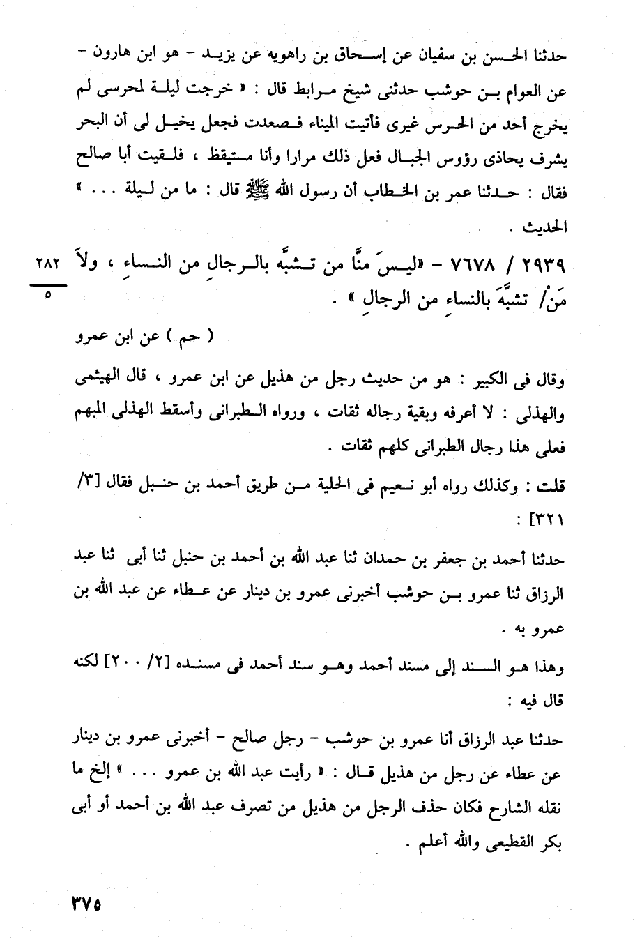 حدثنا عبد الرزاق أنا عمرو بن حوشب -رجل صالح- أخبرنى عمرو بن دينار عن عطاء عن رجل من هذيل قال: "رأيت عبد اللَّه بن عمرو. . . " إلخ ما نقله الشارح فكان حذف الرجل من هذيل من تصرف عبد اللَّه بن أحمد أو أبي بكر القطيعى واللَّه أعلم.