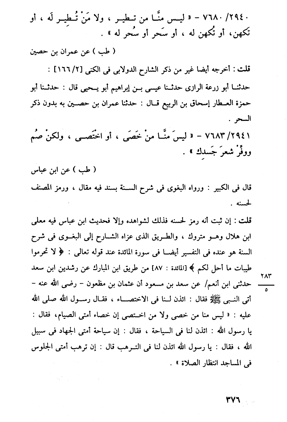 2941/ 7683 - "ليسَ منَّا منْ خَصَى، أو اخْتَصى، ولكنْ صُم ووفِّرْ شعرَ جَسدِك".