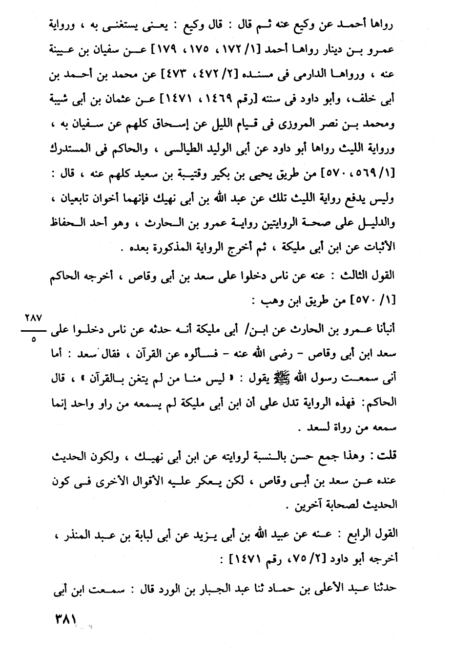 أنبأنا عمرو بن الحارث عن ابن أبي مليكة أنه حدثه عن ناس دخلوا على سعد ابن أبي وقاص -رضي اللَّه عنه- فسألوه عن القرآن، فقال سعد: أما أنى سمعت رسول اللَّه -صلى اللَّه عليه وسلم- يقول: "ليس منا من لم يتغن بالقرآن"، قال الحاكم: فهذه الرواية تدل على أن ابن أبي مليكة لم يسمعه من راو واحد إنما سمعه من رواة لسعد.