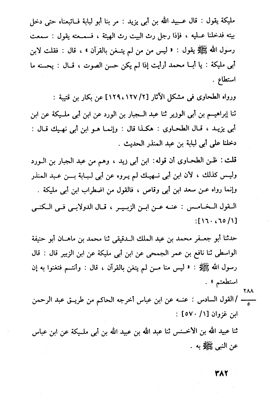 مليكة يقول: قال عبيد اللَّه بن أبي يزيد: مر بنا أبو لبابة فاتبعناه حتى دخل بيته فدخلنا عليه، فإذا رجل رث البيت رث الهيئة، فسمعته يقول: سمعت رسول اللَّه -صلى اللَّه عليه وسلم- يقول: "ليس منا من لم يتغن بالقرآن"، قال: فقلت لابن أبي مليكة: يا أبا محمد أرأيت إذا لم يكن حسن الصوت، قال: يحسنه ما استطاع.