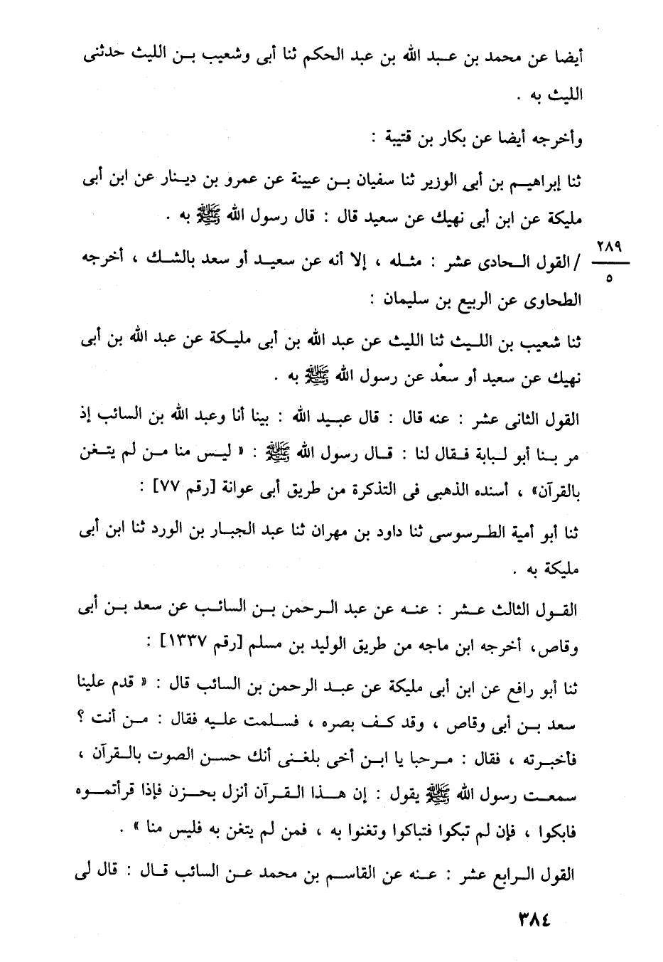 ثنا أبو رافع عن ابن أبي مليكة عن عبد الرحمن بن السائب قال: "قدم علينا سعد بن أبي وقاص، وقد كف بصره، فسلمت عليه فقال: من أنت؟ فأخبرته، فقال: مرحبا يا ابن أخى بلغنى أنك حسن الصوت بالقرآن، سمعت رسول اللَّه -صلى اللَّه عليه وسلم- يقول: إن هذا القرآن أنزل بحزن فإذا قرأتموه فابكوا، فإن لم تبكوا فتباكوا وتغنوا به، فمن لم يتغن به فليس منا".