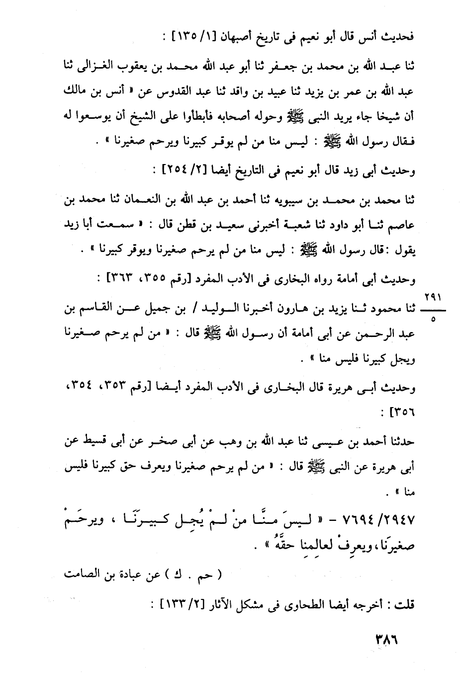ثنا عبد اللَّه بن محمد بن جعفر ثنا أبو عبد اللَّه محمد بن يعقوب الغزالى ثنا عبد اللَّه بن عمر بن يزيد ثنا عبيد بن واقد ثنا عبد القدوس عن "أنس بن مالك أن شيخا جاء يريد النبي -صلى اللَّه عليه وسلم- وحوله أصحابه فأبطاوا على الشيخ أن يوسعوا له فقال رسول اللَّه -صلى اللَّه عليه وسلم-: ليس منا من لم يوقر كبيرنا ويرحم صغيرنا".