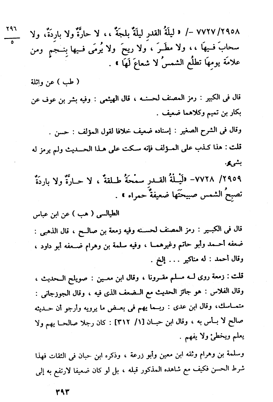 2959/ 7728 - "لَيلةُ القدرِ سمْحَةُ طلقةٌ، لا حارَّةٌ ولا باردَةٌ تصبِحُ الشمس صبيحَتَها ضعيفةٌ حمراء".